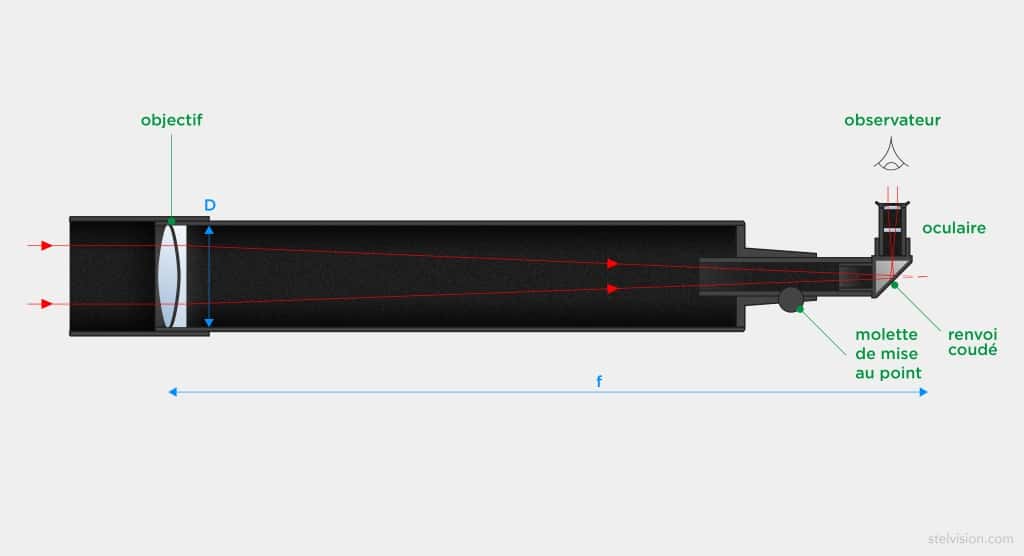 Schéma de principe de la lunette astronomique. © Illustration Valentine Dubois, Stelvision