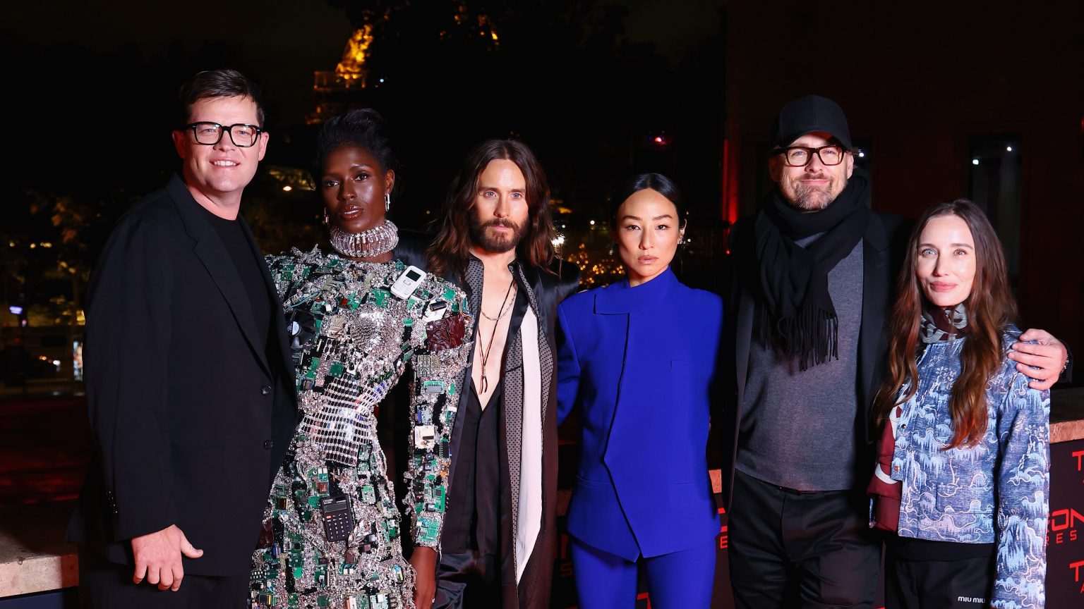 Le Palais de Tokyo, sublimé pour l'occasion par des projections magnétiques évoquant les motifs lumineux de la franchise, a accueilli l'équipe dans une ambiance nocturne. Les photos officielles capturent les participants posant devant un mur arborant le logo « TRON ARES » en rouge éclatant, avec la silhouette étincelante de la Tour Eiffel en arrière-plan. Jared Leto, en manteau noir fluide et pantalon ample, arbore une allure mystique avec ses longs cheveux et sa barbe, fixant l'objectif d'un regard intense. Greta Lee, vêtue d'un ensemble bleu structuré, apporte une touche d'élégance minimaliste, tandis que Jodie Turner-Smith impressionne dans une robe courte ornée de circuits électroniques et de composants high-tech, évoquant directement l'esthétique cybernétique du film.