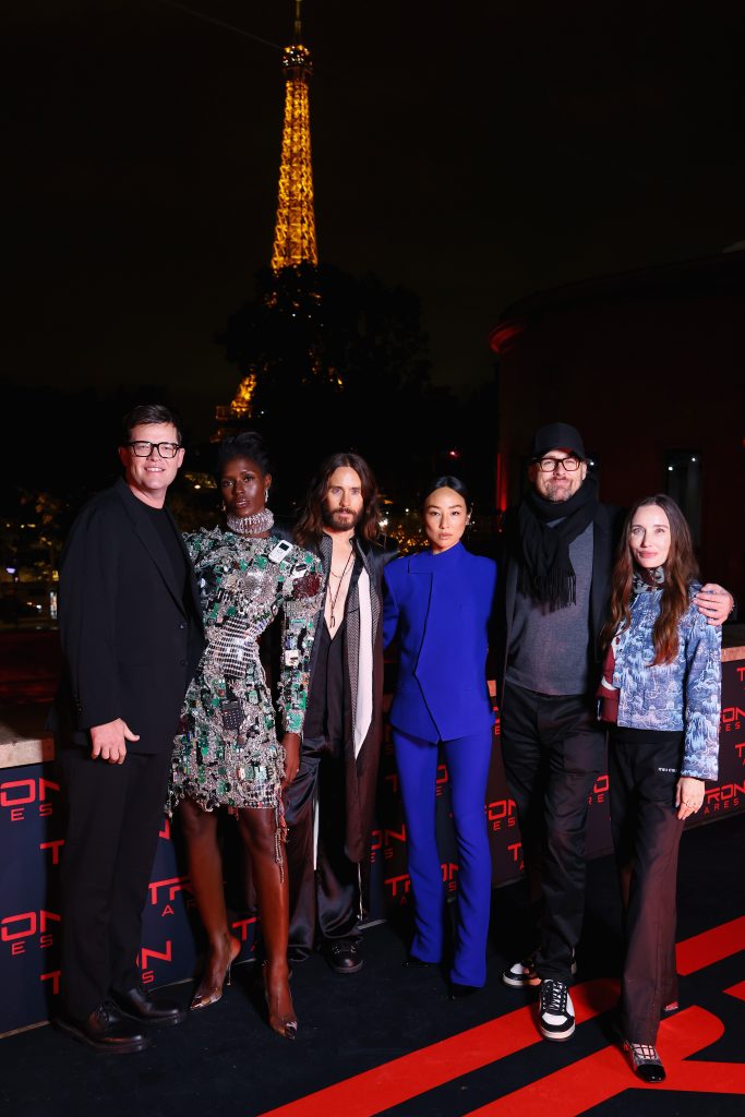 Une image de groupe réunit six personnes : Justin Springer, producteur, Jodie Turner-Smith dans sa tenue futuriste, Jared Leto au centre, Greta Lee en bleu, Joachim Rønning, réalisateur, et Emma Ludbrook, productrice. Des clichés individuels, comme celui de Joachim Rønning en tenue décontractée avec casquette et écharpe, ou un portrait rapproché de Jared Leto soulignant ses bijoux et son col ouvert, complètent le tableau de cette soirée.