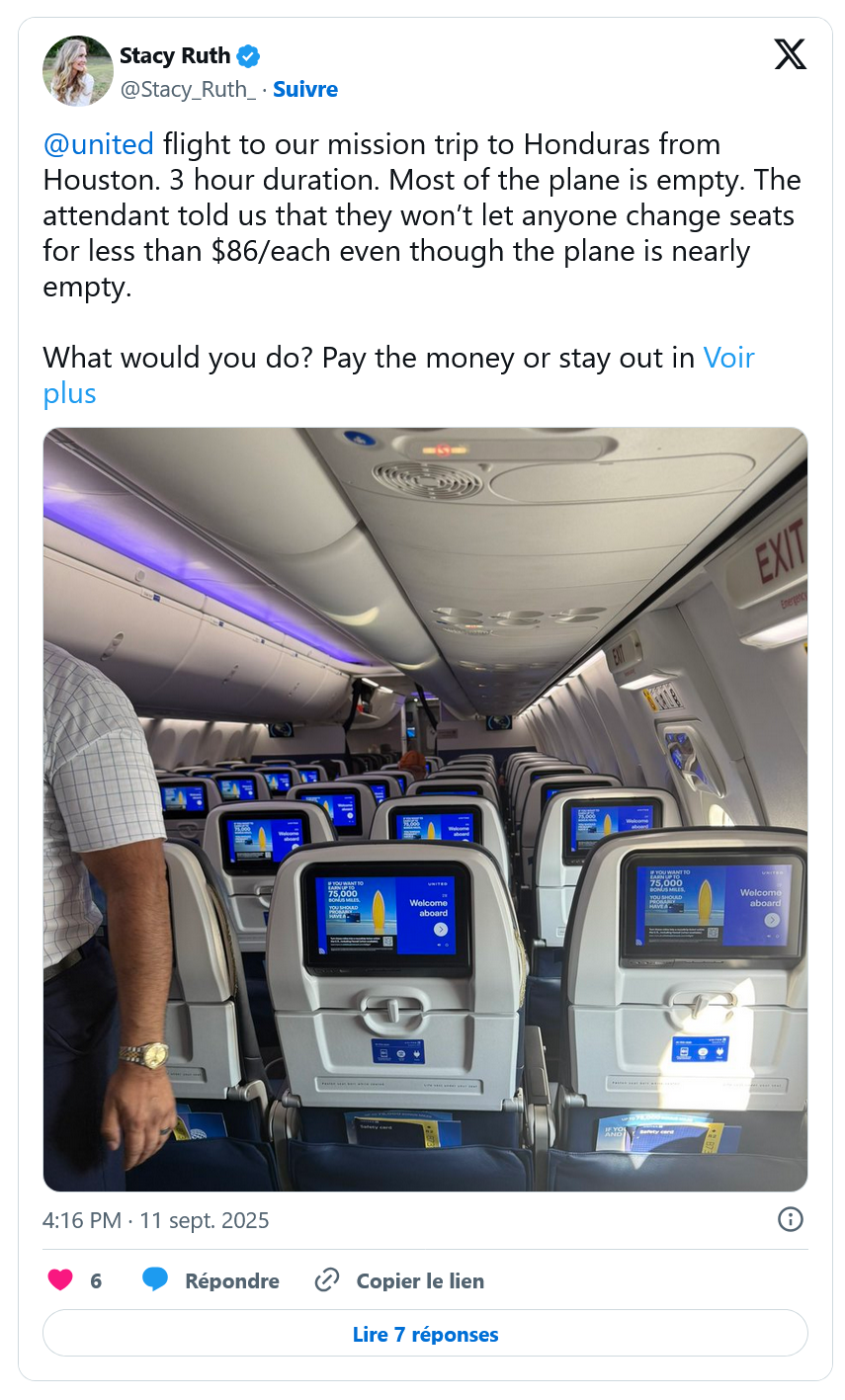 Une passagère de United Airlines l'a découvert à ses dépends, en partageant son indignation sur X. Montrant une photo d'une rangée de sièges vides devant elle, elle a été surprise d'apprendre, par une hôtesse de l'air, qu'elle devait payer environ 80 euros pour occuper l'un de ses sièges vides.
