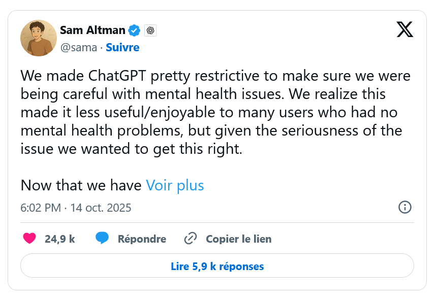 Sam Altman justifie l'apparition de ce nouveau type de contenus car il juge que ChatGPT était devenu "moins utile/agréable pour de nombreux utilisateurs sans problème de santé mentale". La raison ? Les restrictions mises en place suite à plusieurs poursuites lancées contre l'IA, notamment celle des parents d'Adam Raine, un jeune californien qui s'était suicidé suite à des conseils suggérés par ChatGPT.