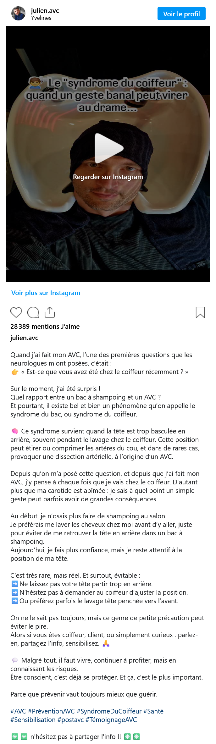 Effectivement, quelques jours avant de faire son AVC, Julien explique qu'il a bien été chez son coiffeur. Ce trouble rare, également appelé syndrome du bac ou syndrome du salon de beauté, survient lorsqu'une personne subit une hyperextension du cou pendant le lavage des cheveux, comprimant une artère vertébrale et réduisant l'afflux sanguin vers le cerveau.