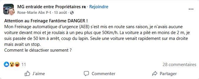 Une situation effrayante qui a donné lieu à la création d'un groupe Facebook : Collectif "Freinages fantômes" automobiles. "Des centaines de témoignages d'incidents de ce type ont été recensées, beaucoup de marques sont concernées", pose l'administrateur. Sur les réseaux sociaux, des utilisateurs s'interrogeaient, dès cet été, sur ces freinages impromptus. "Mon Freinage automatique d'urgence (AEB) s'est mis en route sans raison, je n'avais aucune voiture devant moi et je roulais à un peu plus que 50 km/h. La voiture a pilé en moins de deux mètres, je suis passée de 50 km/h à l'arrêt... Coup du lapin", raconte une internaute.
