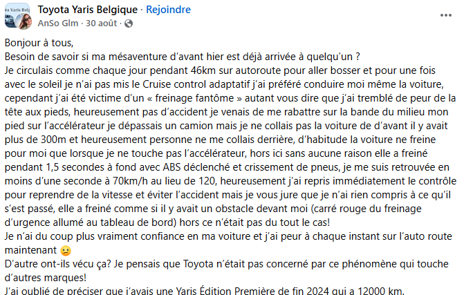 Une automobiliste belge témoigne : "Sans aucune raison, la voiture a freiné pendant 1,5 seconde à fond avec ABS (système anti-blocage de roues) déclenché et crissement de pneus. Je me suis retrouvée en moins d'une seconde à 70 km/h au lieu de 120." Avant d'ajouter : "Je vous jure que je n'ai rien compris à ce qu'il s'est passé, elle a freiné comme s'il y avait un obstacle devant moi (carré rouge du freinage d'urgence allumé au tableau de bord) hors ce n'était pas du tout le cas !"