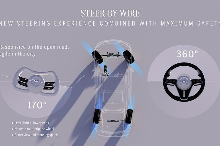 Par ailleurs, le tableau de bord et les portières sont ornés de magnifiques incrustations de nacre, ainsi que d'un imposant volant à quatre branches, digne d'une voiture de collection. Ce volant, orné d'un axe en verre orné du logo Mercedes, est relié à la direction assistée électrique et aux roues arrière directrices, réduisant ainsi le rayon de braquage et évitant ainsi de tourner constamment le volant.