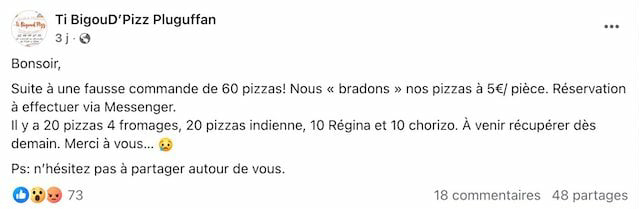 « Suite à une fausse commande de 60 pizzas, nous “bradons” » nos pizzas à 5 euros pièce. Réservation à effectuer via Messenger. Il y a 20 pizzas 4 fromages, 20 pizzas indienne, 10 Régina et 10 chorizo. À venir récupérer dès demain. (...) N'hésitez pas à partager autour de vous », a-t-il écrit.