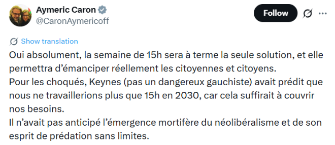 “La semaine de 15 heures sera à terme la seule solution et elle permettra d'émanciper réellement les citoyennes et citoyens”, a-t-il indiqué sur X ce mercredi 10 décembre.