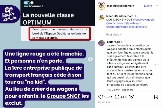 Ce jeudi 22 janvier, le podcast engagé pour l'enfance « Les adultes de demain » a dénoncé l'offre « Optimum Plus » dans une publication Instagram. Les auteurs du post accusent la SNCF de suivre la « tendance dangereuse du “no kids“ ».