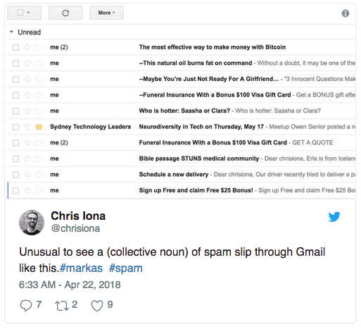 En effet, un certain nombre d'utilisateurs de Gmail ont eu la mauvaise surprise de voir une dizaine de spams dans leurs boîtes mail. Un fait rarissime quand on sait que le service de messagerie de Google est connu pour ne se tromper que très rarement dans l'identification des messages indésirables. Le problème ici, c'est qu'en plus d'avoir laissé passer des mails indésirables, Gmail indique que ces derniers ont été envoyés par le propriétaire du compte lui-même puisqu'ils se retrouvent également dans la partie Envoyés.