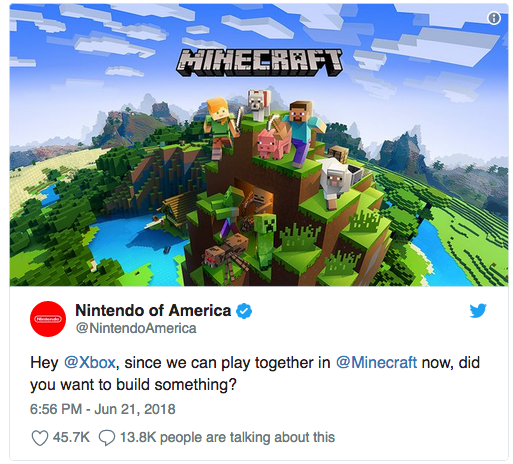 Effectivement, Nintendo aurait très bien pu publier une vidéo dans son coin pour annoncer le cross-play sur Minecraft. Mais clairement, l'intention du Japonais est de se payer Sony qui n'a pas franchement la volonté de changer sa position sur cette question. Pour tenter de faire changer d'avis Sony, tout a été savamment orchestré avec une belle phrase directement destinée à la firme japonaise : "Jamais Minecraft n'aura été aussi grand, aussi fantastique et aussi beau !" et les images véhiculent le même message puisque deux joueurs partagent la même expérience de jeu avec deux manettes différentes : une de Xbox One et une autre de Switch.