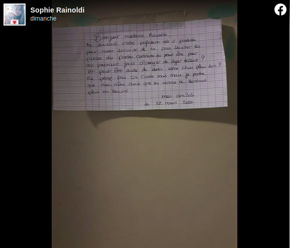 Après les interrogations nées de cet épisode, Sophie Rainoldi est plus que motivée pour continuer à soigner les malades du coronavirus. Pas question pour elle de quitter son logement et d'aller balader son bouledogue français "plus loin". Pour l'heure, l'auteur du mot, lui, ne s'est toujours pas fait connaître.