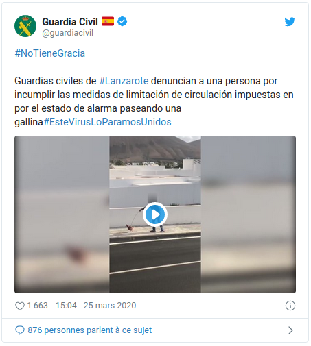 Bien sûr, la vidéo sur laquelle on le voit balader le gallinacé est devenue virale aussitôt publiée sur les réseaux sociaux. Elle a donc attiré l'attention de la Guardia Civil de Lanzarote, dans l'archipel espagnol des Canaries.
