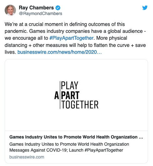 L'OMS a déclaré par l'intermédiaire de Ray Chambers, haut responsable de l'organisation, que l'audience mondiale des entreprises de jeux vidéo est un véritable atout pour faire passer le message de prévention dans la lutte contre le coronavirus. Il encourage d'ailleurs tout le monde à participer à #PlayApartTogether et milite pour davantage de distanciation sociale ainsi que d'autres mesures pour aplanir la courbe et sauver des vies.