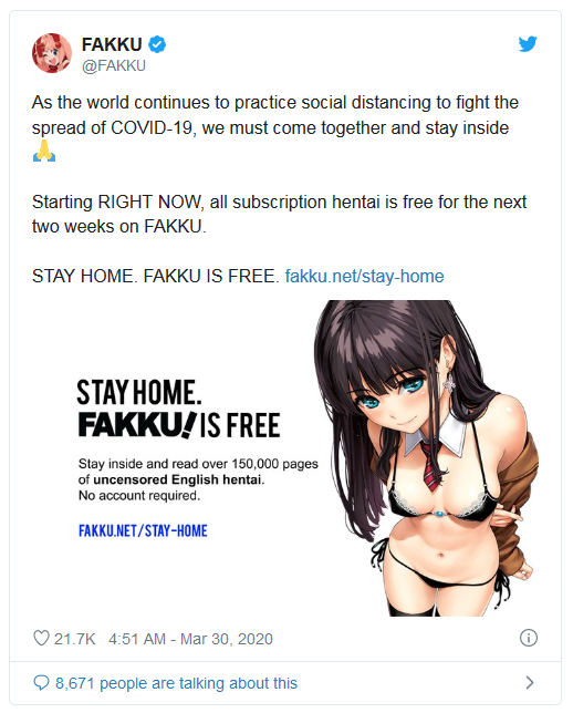 Alors qu'une partie du globe se retrouve confinée chez soi à cause de la pandémie de Covid-19, les acteurs des Internets prennent des dispositions pour accommoder au mieux les personnes confinées. Sur Twitter, le site de Hentai Fakku a annoncé le 30 mars dernier que pour les deux semaines à venir, tout son contenu serait accessible gratuitement. Une annonce qui n'est pas tombée dans l'oreille d'un sourd puisque, comme le rapporte Vice, le site a dû effectuer une maintenance quelques heures après la publication de son tweet.