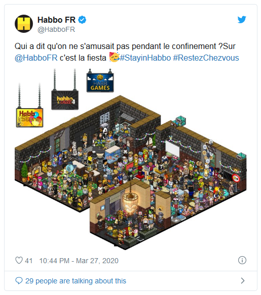 Connu sous le nom d'Habbo Hotel au pic de sa gloire, Habbo a lentement sombré dans les méandres de la toile. Mais grâce au confinement, ce monde virtuel a enregistré une forte hausse de son trafic : 213% d'augmentation d'utilisateurs dans le monde ainsi qu'une hausse de 134% du temps passé en jeu sur la période du 25 février au 24 mars. Une statistique intéressante pour un monde virtuel qui comptabilisait plus de 273 millions d'avatars crées en 2013, pour 5 millions d'utilisateurs actifs par mois.