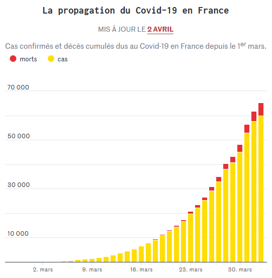 Depuis le 1er mars, Covid-19 a tué 4 503 personnes dans les hôpitaux, dont 471 entre mercredi et jeudi. Au moins 884 personnes âgées sont aussi décédées dans les maisons de retraite depuis le début de l'épidémie, selon un premier bilan officiel, quoique partiel, annoncé jeudi. Par ailleurs, près de 6 400 personnes nécessitent des soins lourds en réanimation, soit 382 de plus en un jour.