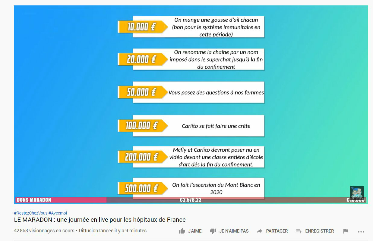 En direct sur YouTube dès 9 heure, McFly et Carlito ont reçu au cours de la journée des personnalités comme Guillaume Canet, Pierre Niney ou encore Cyprien et Natoo pour participer à des jeux et autres quizz. Régulièrement, ils appelaient les internautes à faire des dons en promettant de réaliser des défis en fonction des sommes reçues. Ainsi, lorsque la barre des 100.000 euros a été franchie, Carlito s'est fait une crête. A 500 000, les deux compères avaient promis de faire l'ascension du Mont Blanc cette année. Ils n'iront pas escalader le Toit de l'Europe, mais iront poser nus en vidéo devant une classe d'école d'art à la fin du confinement.
