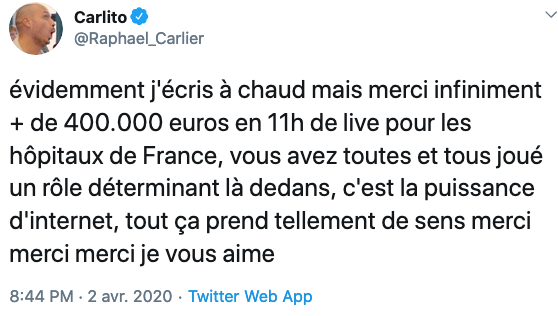 En effet, ils sont parvenus à récolter une somme incroyable : 400 000 euros de dons à l'issu des 11 heures de live !