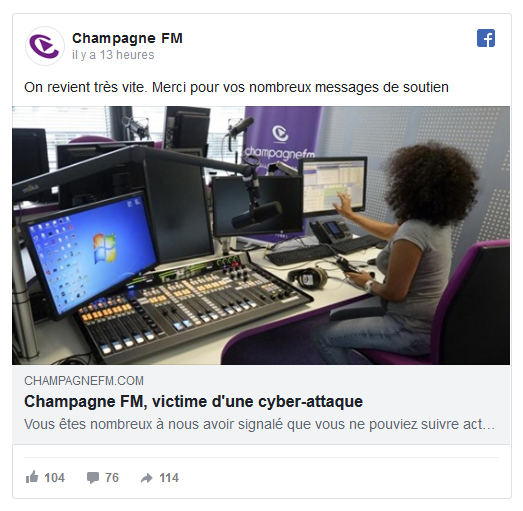Le réseau Champagne FM a rapidement été isolé du reste des entités du groupe Rossel (L'Union, La Voix du Nord, etc.). Le redémarrage des serveurs étant impossible, un flux musical est actuellement diffusé sur les ondes. "On espère, mais c'est une hypothèse optimiste, reprendre mercredi." La remise en service du système nécessite une analyse des serveurs, le reformatage des ordinateurs et la réinstallation de 900 Go de données.