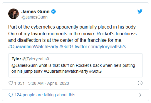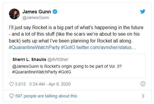 James Gunn : Je dirais juste que Rocket représente une grosse partie de ce qui va arriver dans le futur. Et beaucoup de ces trucs (comme les cicatrices que nous avons vu sur son dos) amènent ce que j'ai prévu pour Rocket depuis toujours."