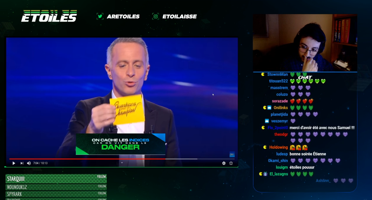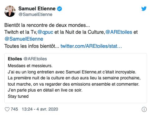 Et ces streams ont attiré l'attention de Samuel Etienne, le présentateur du jeu de France 3 qui a succédé à Julien Lepers. Celui-ci n'a pas hésité à prendre contact avec Etoiles sur Twitter pour en savoir plus sur son concept. Le streamer et Samuel Etienne échangent sur le réseau social et très vite ils commencent à réfléchir à proposer un rendez-vous en duo sur Twitch pour animer une Nuit de la Culture. L'animateur du jeu est très intéressé car il s'est même créé un compte sur Twitch pour suivre quelques uns des rendez-vous d'Etoiles et n'hésite pas à participer dans le tchat de la plateforme.