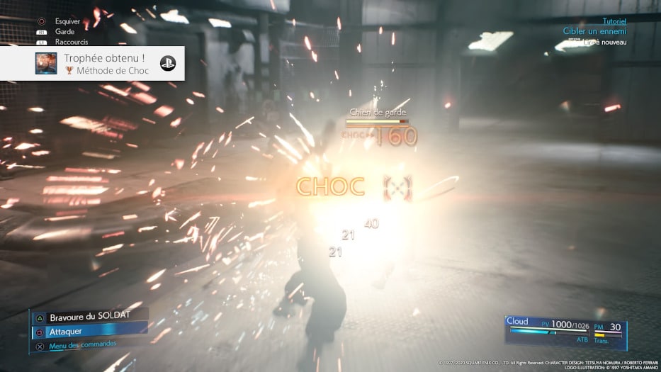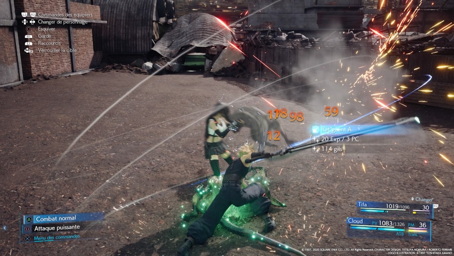 Cette comparaison avec FFXV se renforce une fois la partie lancée. Final Fantasy VII Remake donne la part belle à l'action en offrant à Cloud toute la place nécessaire pour combattre. Deux boutons de la manette servent à donner différents coups d'épée et deux autres touches servent à parer et à esquiver les coups. Ces différentes actions servent à remplir une jauge d'action qui débloque des coups spéciaux (Transcendance) quand elle dépasse certains seuils. Un menu simplifié appelé Menu des Commandes sert à lancer des sorts élémentaires, des invocations et des compétences, à utiliser des objets et à déclencher les transcendances. Tout est fait pour ne pas gêner l'action.