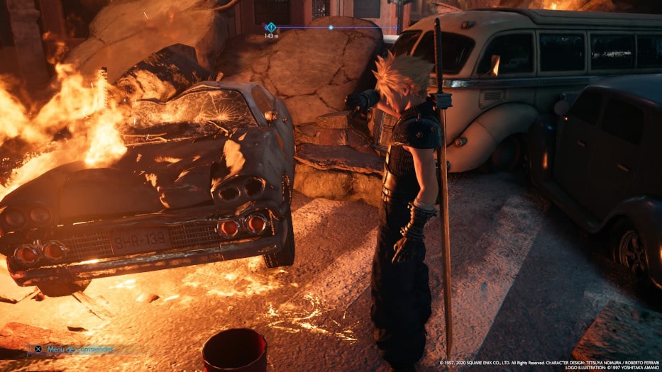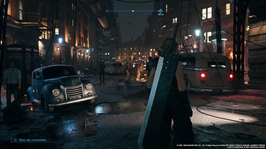 Ce jeu est techniquement très impressionnant. D'abord au niveau visuel, avec des effets de lumières, de fumée, ou au niveau de la modélisation des personnages, notamment Cloud que vous voyez le plus souvent. Il tourne la tête quand un passant le bouscule. Il protège son visage face au feu (ci-dessous). Il se redresse quand il descend un escalier. Ensuite au niveau sonore, avec des bruitages vivants, des dialogues intégralement doublés et sous-titrés (avec voix japonaises accessibles dès le début, sans DLC) et une bande-son réorchestrée par son compositeur originel, le grand maître Nobuo Uematsu. Ce sont des détails. Mais tout est question de détail.