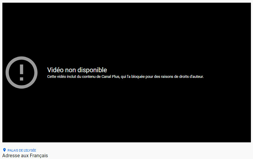 Le 13 avril 2020, le Président de la République s'est exprimé lors d'un discours officiel sur de nombreuses chaines de télévision en simultané, ainsi que sur les réseaux sociaux. La chaine officielle Emmanuel Macron diffusait également le discours en direct. Malheureusement, peu de temps après la diffusion en live, la vidéo a été bloquée par YouTube pour des raisons de droits d'auteur. Si vous avez manqué le discours, le voici juste ci-dessous :