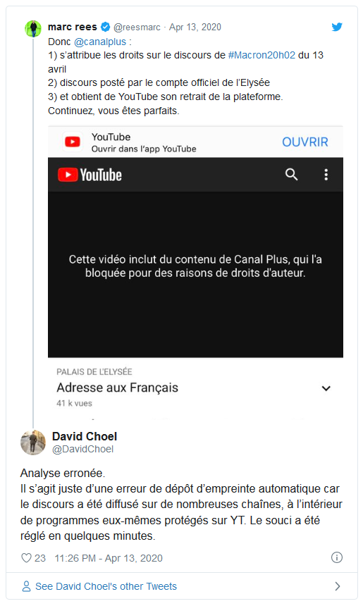 David Choel, la personne en charge des contenus numérique au sein du groupe Canal Plus a été interpellé sur Twitter et précise alors qu'il s'agit d'une erreur de dépôt d'empreinte automatique car le discours a été diffusé sur de nombreuses chaines de télévision.