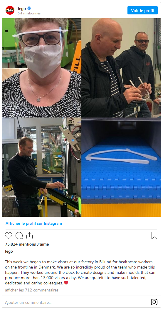 Une cadence qui pourrait atteindre les 50 000 visières par jour. Pour parvenir à ce résultat, le géant danois pourrait réhabiliter ses usines mexicaines et hongroises, même si aucune décision n'a été communiquée concernant ce changement de production. Sur Instagram, la firme n'a pas manqué de saluer les efforts de ses employés, qui "ont travaillé jour et nuit pour dessiner les modèles et créer les moules". LEGO a exprimé sa reconnaissance face à "des collègues aussi talentueux, impliqués et attentionnés".