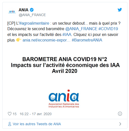 Ces chiffres montrent "l'effort national considérable des entreprises de l'alimentation qui permet à la chaîne alimentaire de tenir, tenir mais à quel prix ?", a demandé le président de l'Ania, Richard Girardot, cité dans un communiqué. "Tous les Français doivent en avoir conscience. Une nouvelle ère s'engagera lors de la sortie de crise, façonnée par une demande durablement modifiée du consommateur, dans ses choix, ses circuits d'achat, son pouvoir d'achat", a-t-il prévenu.