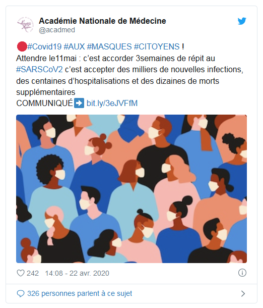 « Une simple recommandation ne peut suffire, chacun devant se considérer comme potentiellement porteur du virus et contagieux, même quand il se sent en bonne santé, insiste l'Académie. Veiller à ne pas contaminer les autres n'est pas facultatif, c'est une attitude citoyenne qui doit être rendue obligatoire dans l'espace public. »