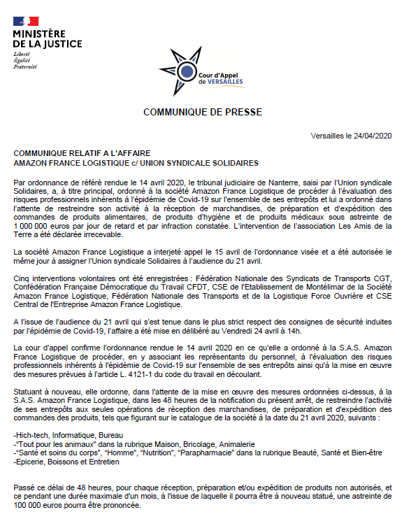 La cour de Versailles a confirmé la précédente condamnation par le tribunal de Nanterre, cependant elle a précisé les catégories des produits qui peuvent être vendus par l'enseigne. Amazon a donc maintenant 48 heures pour se conformer à cette fameuse liste, mais pour le moment les entrepôts sont toujours fermés jusqu'au 26 avril. Néanmoins, la réouverture pourrait être reportée. De plus, l'amende passe de 1 million d'euro à 100 000 euros par jour en cas d'infraction.