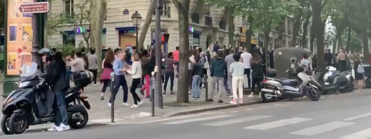 Une vingtaine de personnes qui dansent, enjouées, sur le titre Laissez-moi danser, de Dalida. Un couple qui s'enlace, sourire aux lèvres, sous les arbres. En plein confinement, des habitants du 18e arrondissement de Paris ont été filmés oubliant totalement les règles de distanciation sociale, samedi 25 avril. Sur la courte séquence diffusée sur Twitter par un journaliste, on voit une trentaine de personnes rassemblées dans la rue pour profiter de la musique, diffusée depuis un appartement voisin.