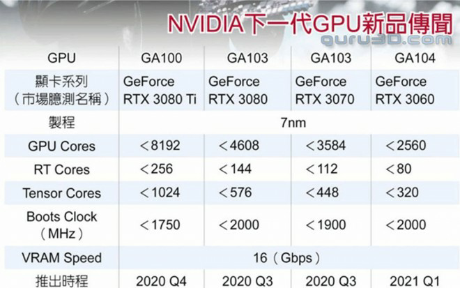 Ces nouvelles cartes graphiques seraient basées sur l'architecture Ampere gravée en 7 nm comme pour la dernière version Turing. La GA100 sera la RTX 3080 Ti, la GA103 se partagera la RTX 3080 et la RTX 3070 et la GA104 sera la RTX3060.