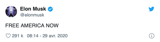 Une déclaration tapageuse qui est intervenue après que le patron de SpaceX a écrit sur Twitter un message appelant à "libérer l'Amérique maintenant".
