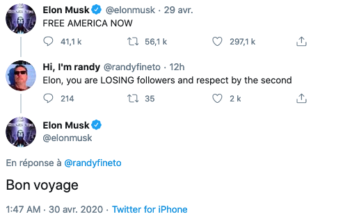 Un tweet qui n'est pas passé inaperçu auprès de ses plus de 33 millions de followers qui n'ont pas tardé à critiquer l'homme d'affaires. Un de ses abonnés s'est même permis de lui souligner qu'avec ses propos, "il était en train de perdre ses followers et le respect". Elon Musk lui a alors répondu par un simple "BON VOYAGE".