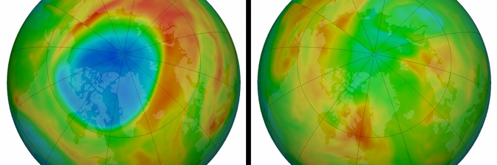 En un mois seulement, l'énorme trou dans la couche d'ozone qui s'étendait sur toute la surface de l'hémisphère nord s'est résorbé comme on peut le voir sur les images fournies par le programme Ozone Watch de la Nasa.