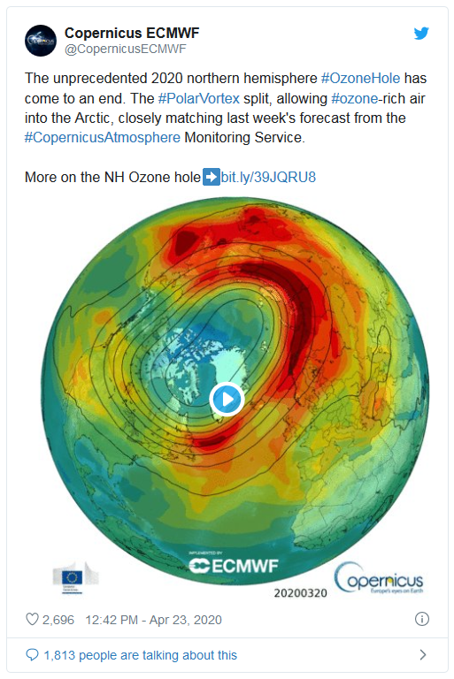 Fin mars-début avril, un énorme trou avait été observé dans la couche d'ozone au-dessus de l'Arctique. Un trou qui faisait environ trois fois la taille du Groenland. Si ce trou dans la couche d'ozone était le plus grand jamais observé dans la région, bonne nouvelle : il s'est refermé !