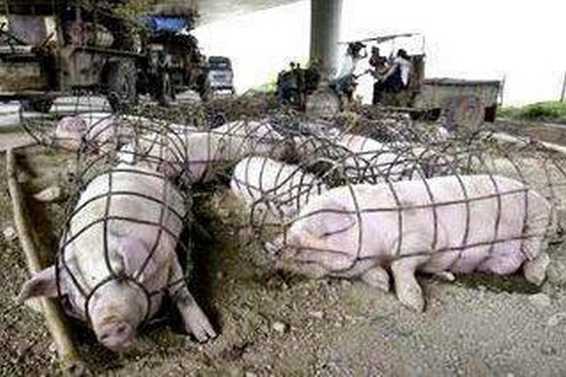 Ces pauvres porcs sont confinés dans des cages qui limitent sévèrement leurs déplacements afin qu'ils engraissent plus rapidement.