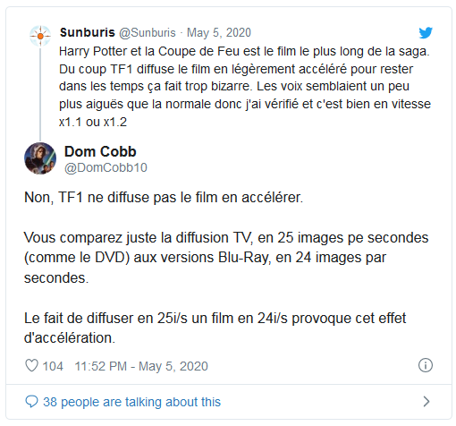 Mais pourquoi les voix des personnages sont-elles plus aigües ? Vous vous êtes sûrement posé la question en regardant pour la 176789ème fois Harry Potter et la Coupe de Feu sur TF1 mardi soir. Non, ce n'est pas une volonté de TF1 d'accélérer le film afin de pouvoir mieux caler ses pubs et ses programmes, en réalité tout est une question d'images par seconde. Quand vous regardez un film au cinéma ou en Blu-Ray, le film est diffusé en 24 images par seconde, alors qu'à la télévision il est diffusé en 25 images par seconde. Tout cela n'est qu'une question de technologie en fonction des contraintes de diffusions en PAL et SECAM. Si le film est diffusé en 24 secondes sur votre téléviseur, l'image sera saccadée.