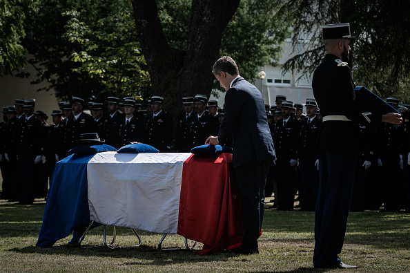 Le ministre de l'Intérieur Gérald Darmanin remet la Légion d'honneur à titre posthume à Mélanie Lemée pendant une cérémonie militaire en son hommage à Mérignac le 9 juillet.