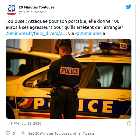 Vers 4 h du matin, une jeune femme de 20 ans a été agressée par deux individus qui voulaient lui dérober son téléphone portable dans le secteur du Capitole.