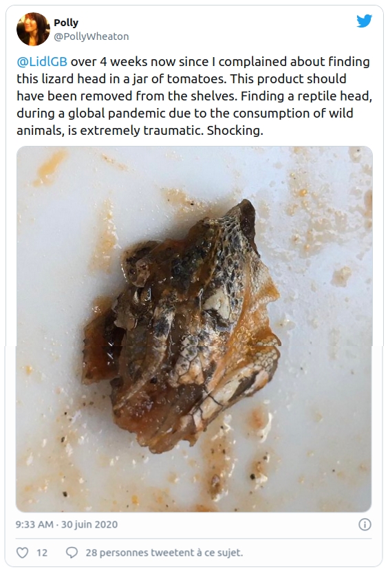 "Le fait que nous ayons trouvé un animal exotique dans notre alimentation au milieu d'une pandémie est choquant". Une cliente de Lidl a exprimé sa colère après avoir trouvé une tête de lézard dans une boîte de sauce bolognaise vegan en mai dernier.