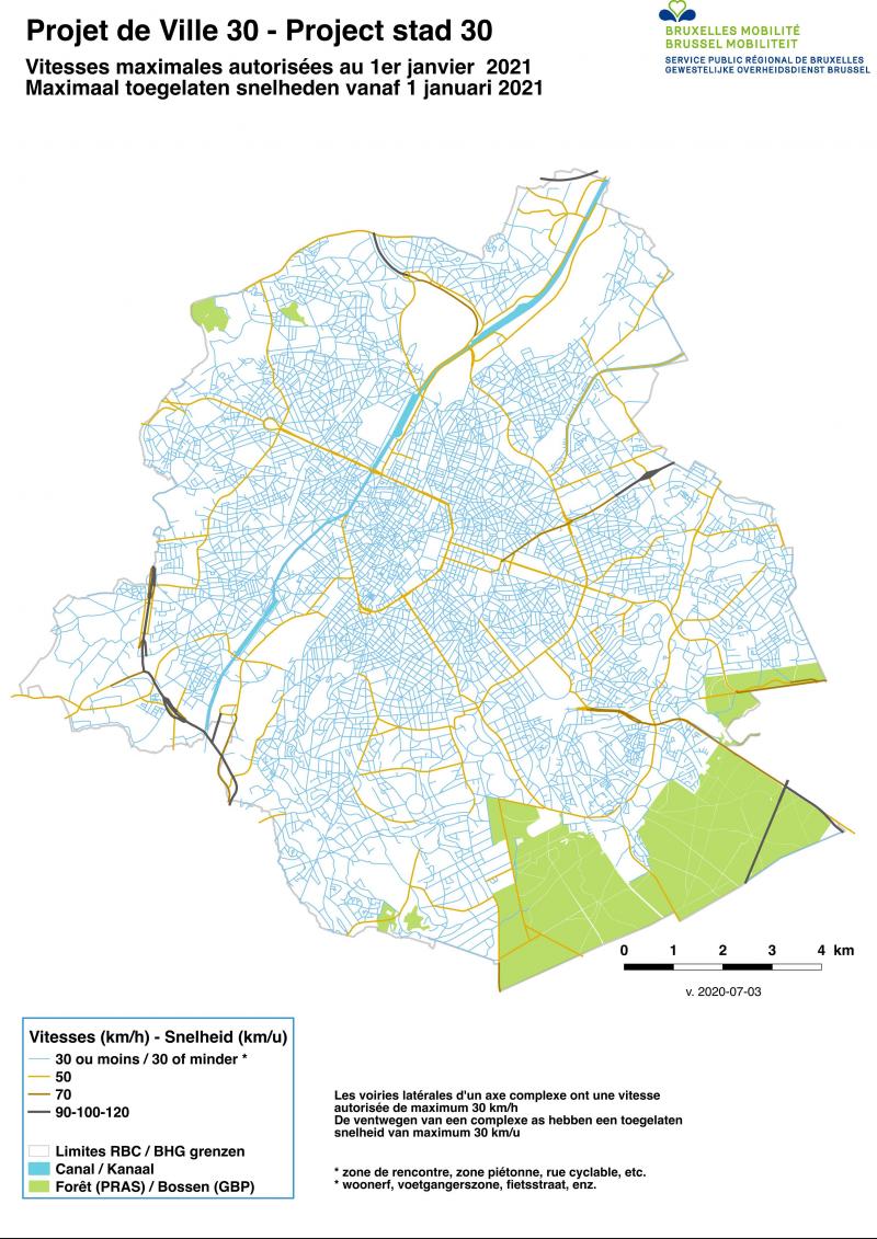 Bruxelles Mobilité a mis en ligne la carte définitive reprenant les exceptions au régime général du 30km/h. Cette carte a fait l'objet de nombreuses négociations avec les communes, les zones de police et les partenaires de mobilité (Stib,...). D'autres instances comme Brupartners (ancien Conseil Economique et Social), Bruxelles Prévention et Sécurité ou encore le SIAMU ont également remis un avis. Ces avis soulignent l'intérêt du projet en termes de sécurité routière et d'apaisement des quartiers, mais rappellent l'importance de tenir compte notamment des vitesses commerciales des transports en commun.