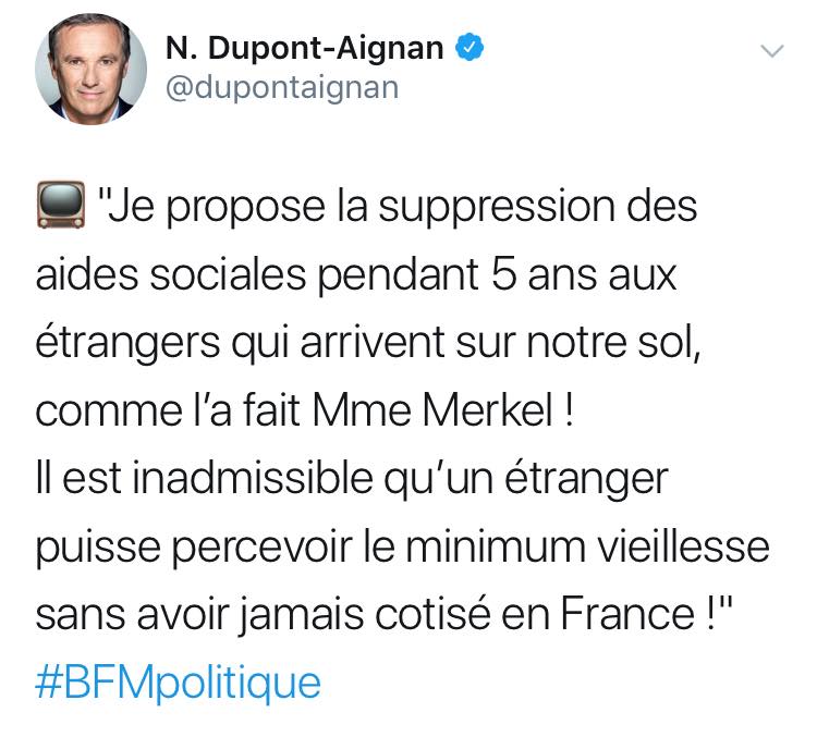 "Je propose la suppression des aides sociales pendant 5 ans aux étrangers qui arrivent sur notre sol, comme l'a fait Mme Merkel ! Il est inadmissible qu'un étranger puisse percevoir le minimum vieillesse sans avoir jamais cotisé en France". #BFMpolitique