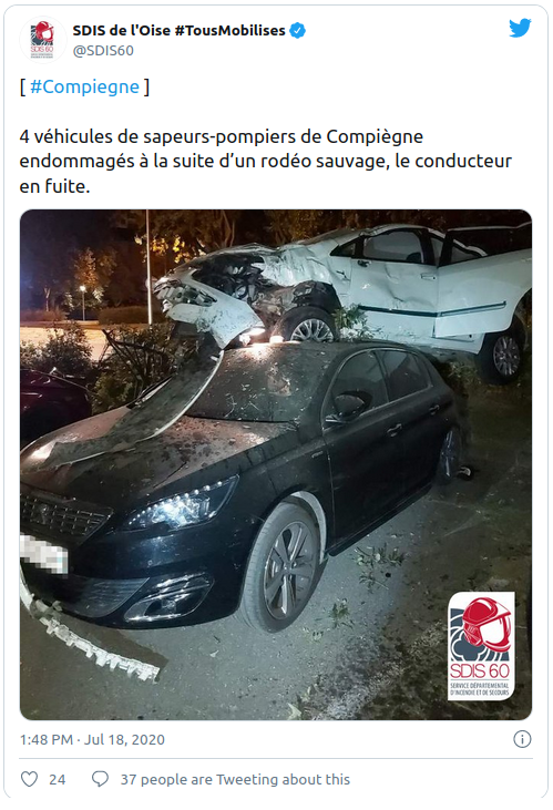4 véhicules de sapeurs-pompiers de Compiègne endommagés à la suite d'un rodéo sauvage, le conducteur en fuite.