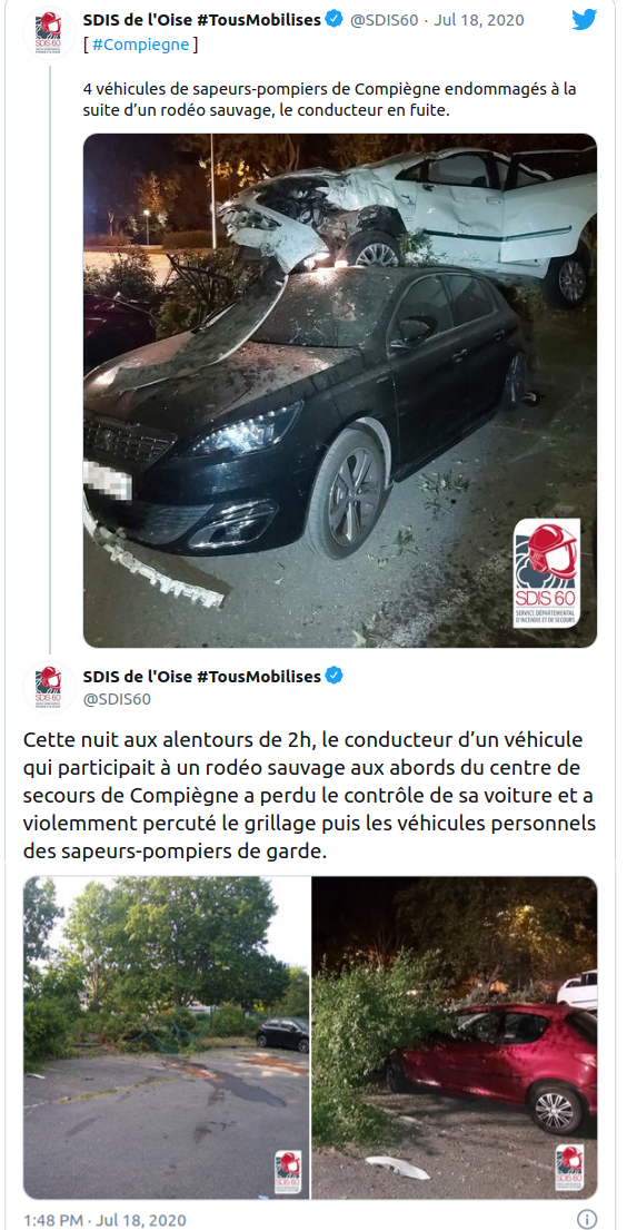 Cette nuit aux alentours de 2h, le conducteur d'un véhicule qui participait à un #rodéo sauvage aux abords du centre de #secours de Compiègne a perdu le contrôle de sa voiture et a violemment percuté le grillage puis les véhicules personnels des sapeurs-pompiers de garde. Le conducteur de la voiture a abandonné l'épave et a pris la fuite avant l'arrivé...e de la police. Le président du conseil d'administration monsieur Eric De Valroger et monsieur le Contrôleur Général Luc Corack, directeur départemental des sapeurs-pompiers de l'Oise, déplorent ces agissements qui pourraient avoir des conséquences humaines dramatiques. Si vous êtes témoin de tels faits, avertissez immédiatement les forces de l'ordre.