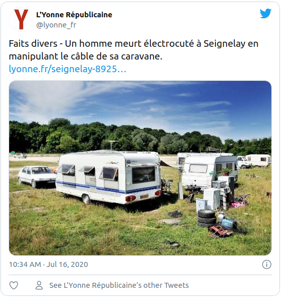 Mercredi 15 juillet, un homme âgé de 26 ans est mort électrocuté en manipulant un câble électrique de sa caravane, à Seignelay, dans le département de l'Yonne.