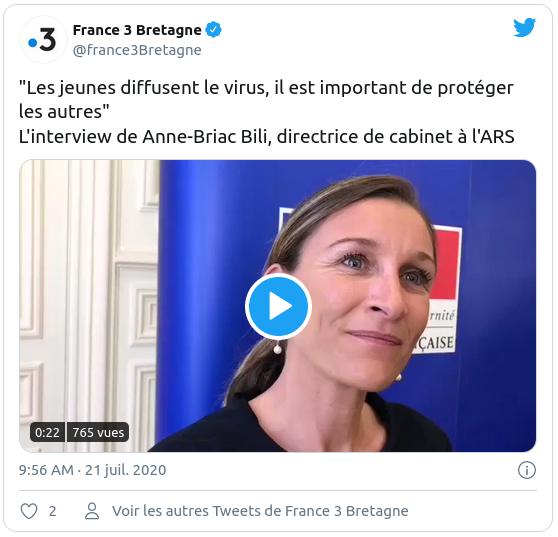 "Cette augmentation n'est pas liée au déconfinement, qui date du 11 mai, mais elle coïncide au début des vacances scolaires et donc à un brassage des populations, des rencontres familiales, des rassemblements privés et donc un relâchement des gestes barrières," précise Michèle Kiry, préfète de région. "Alors qu'auparavant et je m'en félicitais, chaque semaine nous avions entre 5 et 10 cas supplémentaires et même zéro cas certaines semaines mais là, nous avons vraiment un changement, en passant de l'ordre de 10 cas à 100." L'augmentation la plus importante se situe dans le Finistère.